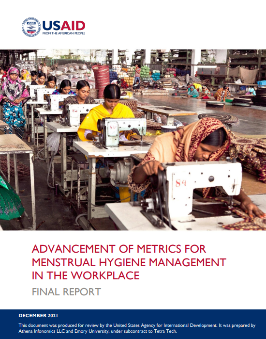 Caruso, B. A., Conrad, A., Salinger, A., Patrick, M., G, M.E., Doma, R., Sinharoy, S.S., Ramaswamy, A., Stephen, A. 2021. Advancement of Metrics for Menstrual Hygiene Management in the Workplace: Interim Progress Report. Washington D.C, USAID Water, Sanitation, and Hygiene Partnerships and Learning for Sustainability (WASHPaLS) Project. [Download PDF]